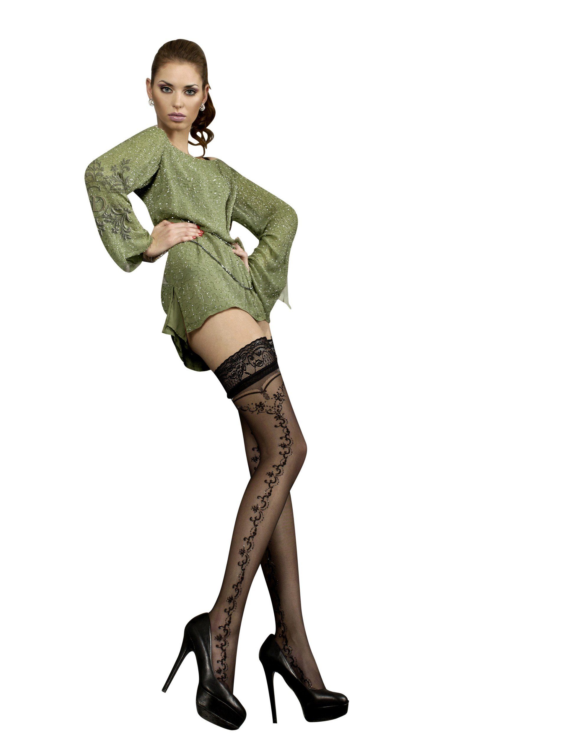 Halterlose strümpfe ähneln im aussehen einer herkömmlichen strumpfhose unterscheiden sich jedoch im wesentlichen darin dass sie lediglich bis zur hälfte des oberschenkels reichen.
